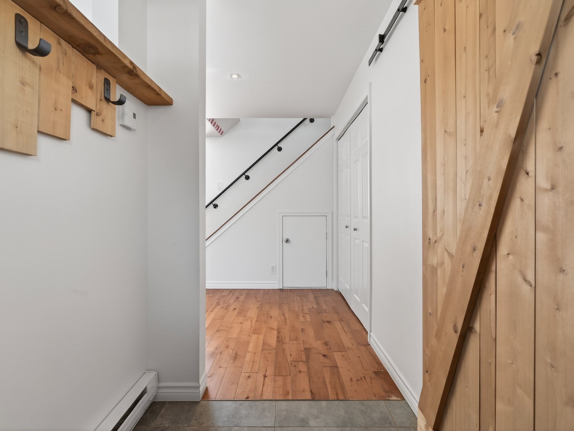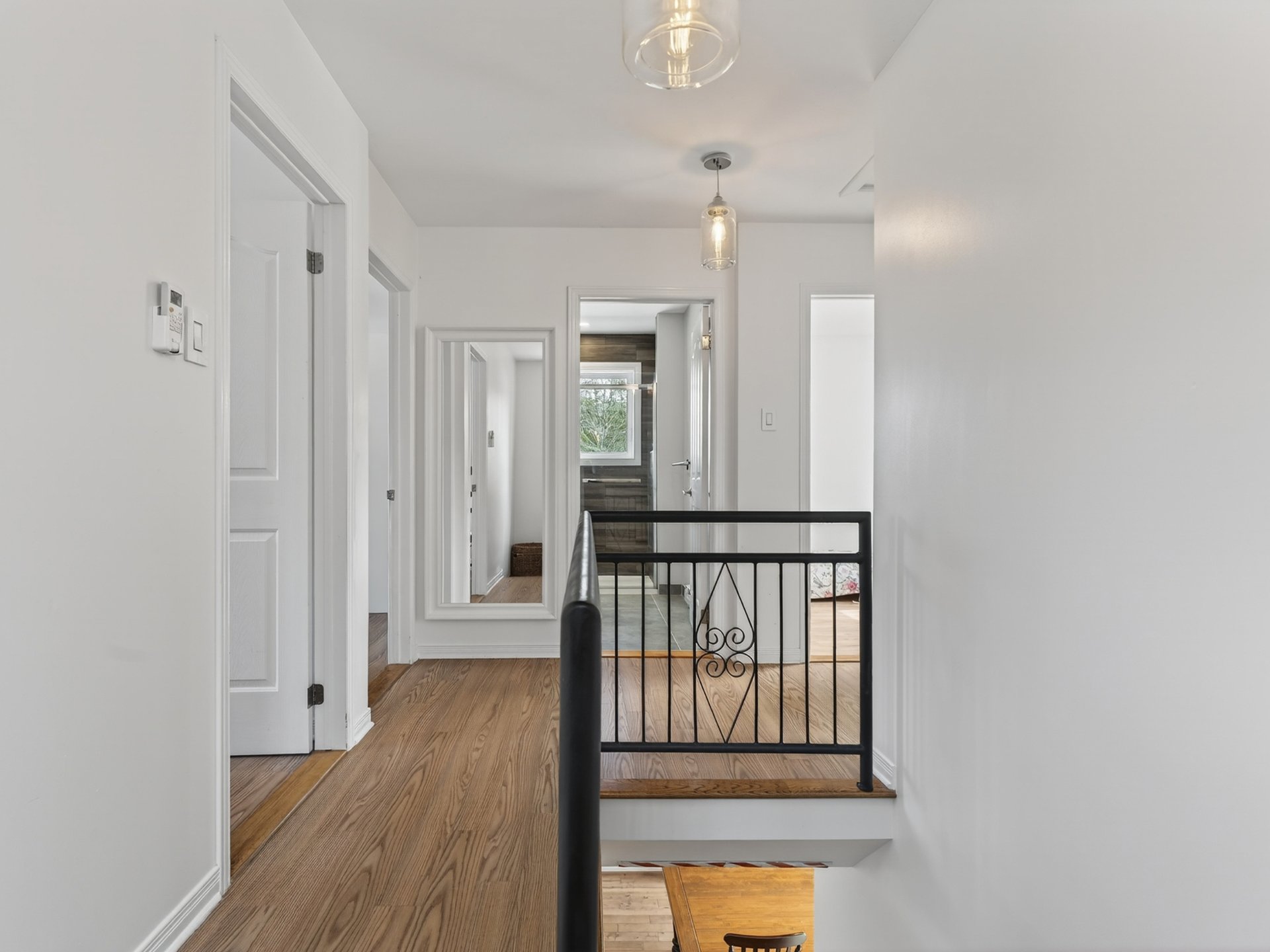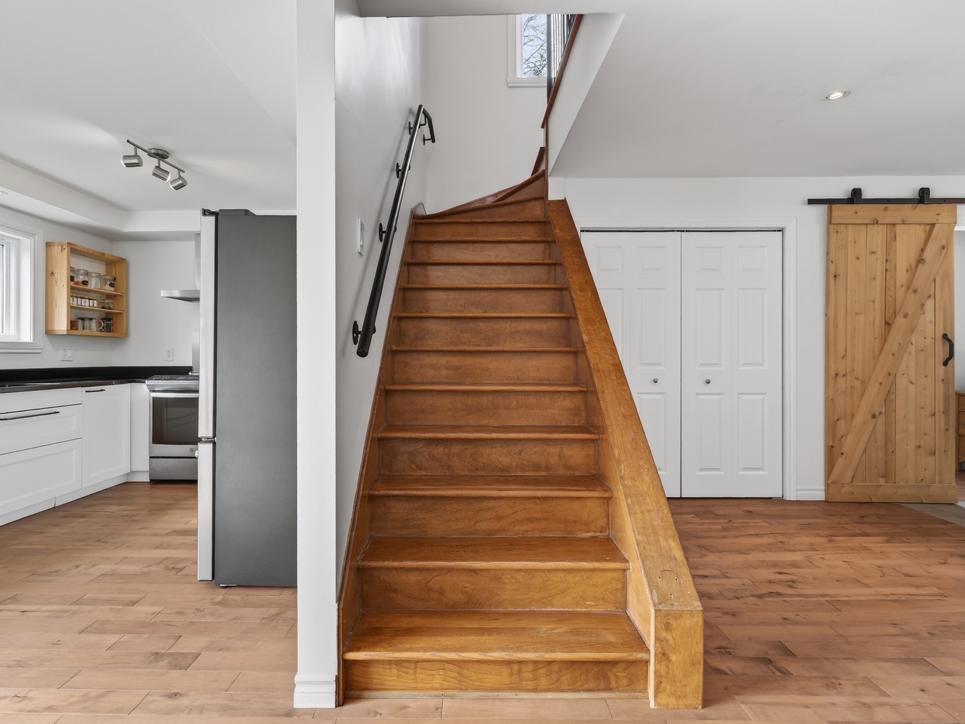 Magnifique escalier en bois menant au 2e étage avec rampe