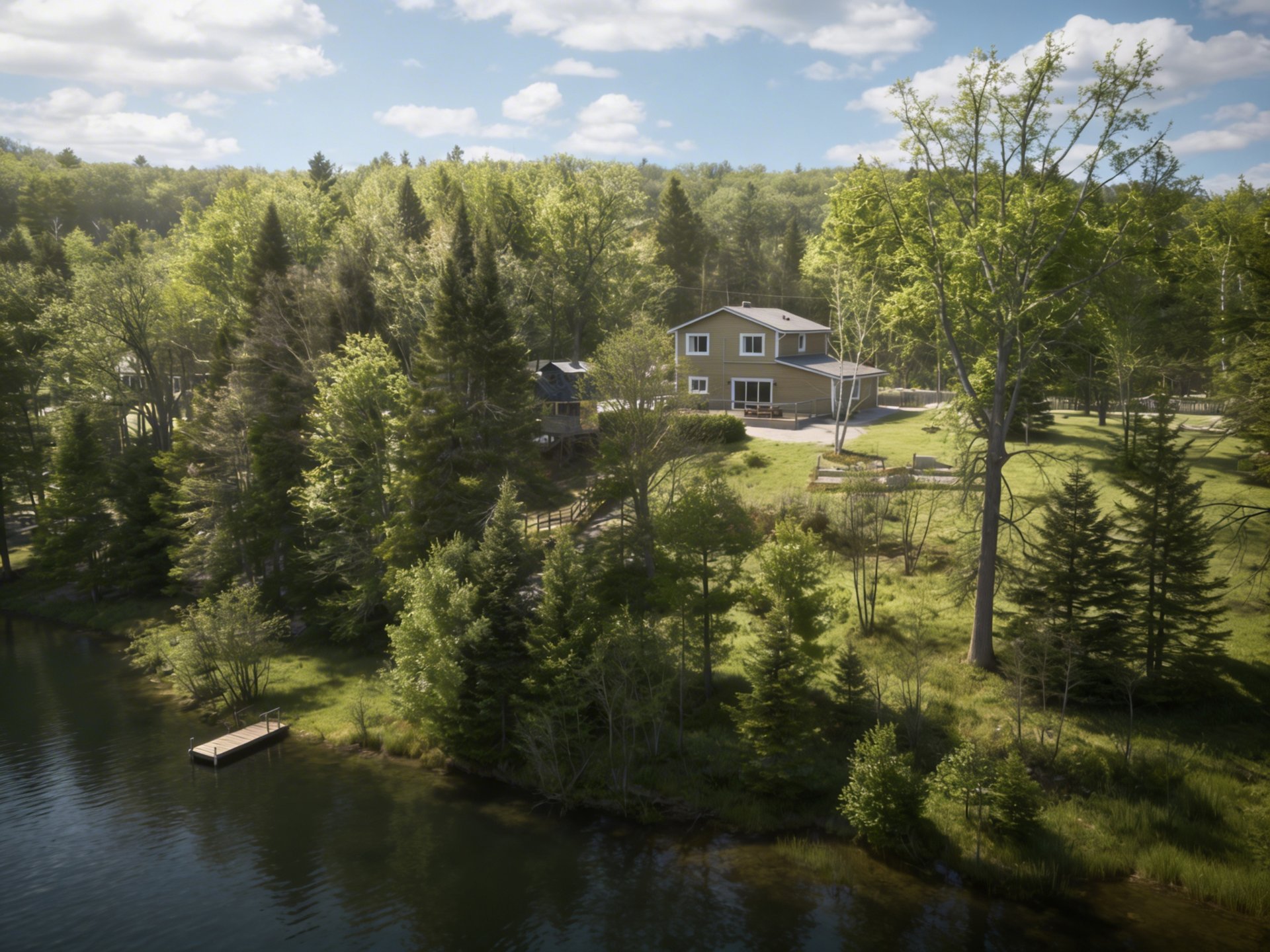 nature environnante. Terrain boisé, accès au lac avec quai,